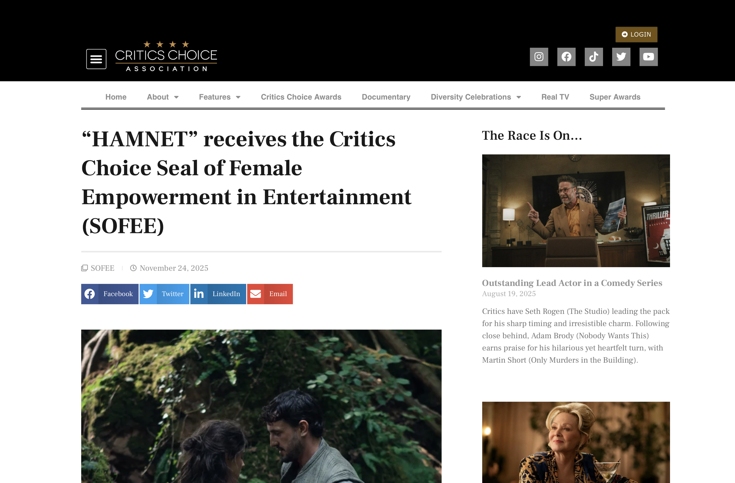 HAMNET has been awarded the Critics Choice Seal of Female Empowerment in Entertainment (SOFEE). Directed by Chloé Zhao and starring Jessie Buckley and Paul Mescal, the film brings to life the untold love story that inspired Shakespeare’s greatest masterpiece.
