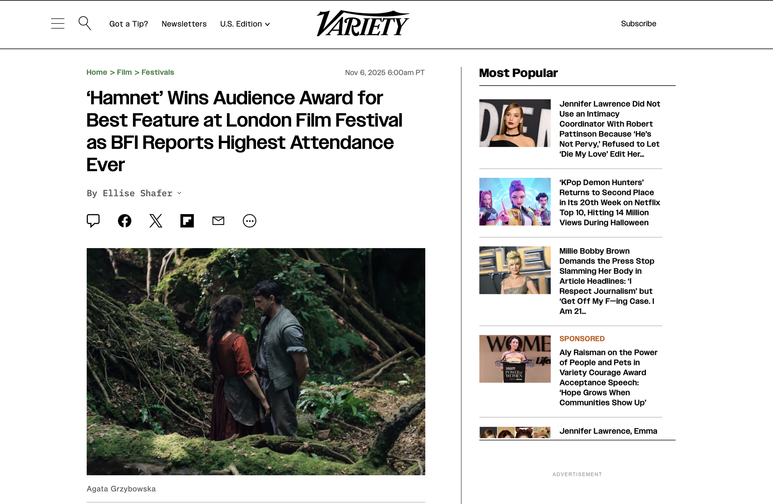 “Hamnet” won the audience award for best feature film at London Film Festival amid its highest attendance ever, the BFI announced on Thursday.